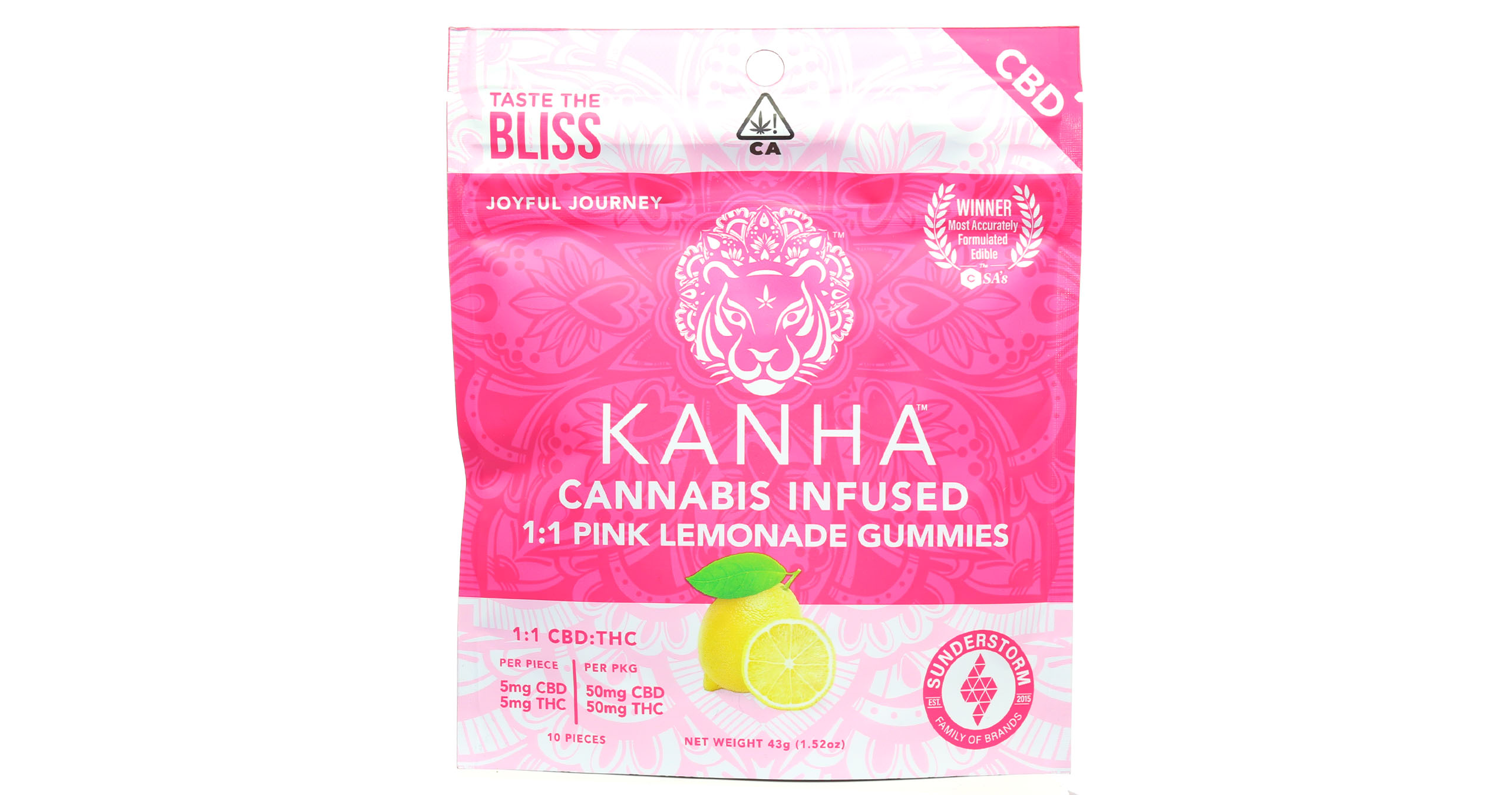 Pink Lemonade | 1:1 | 5mg THC & 5mg CBD per Gummy | 10 Gummies per package | 50mg THC & 50mg CBD Total | Kanha gummies are made with all-natural ingredients, coloring, and flavoring. Each gummy is infused with the highest quality cannabis oils to provide the most consistent, safe experience on the market. Their Pink Lemonade 1:1 gummies are sour yet sweet and made with 5mg CBD and 5mg of THC per gummy. *Effects are not claims and will vary by customer.