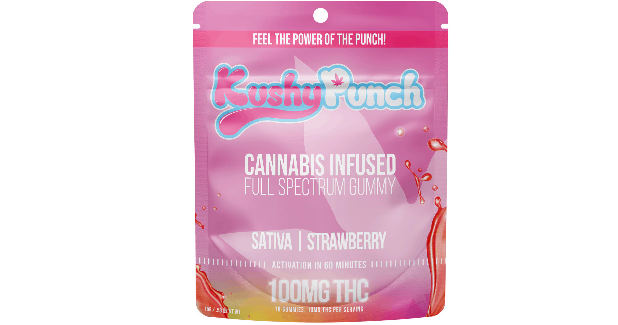 Kushy Punch | Strawberry | Sativa | 10mg THC per Serving | 100mg | 10 Servings per Package | 100mg THC Total | Kushy Punchs 100mg sativa gummy is their top-selling product. Their succulent strawberry flavor is perfectly blended with their earthy, potent full-spectrum oil, giving you a great taste and a rich high that truly stands out from other edibles. Kushy Punch fans love this sativa gummy because its bursting with flavor and popping with euphoric energy. Users love to pop this to awaken their creativity, blast off at a show, or get giddy with the giggles all night.
